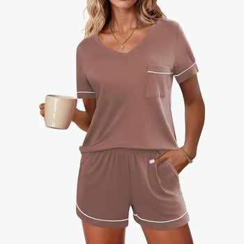 เซ็ตชุดนอนสำหรับผู้หญิง2ชิ้นชุดเลานจ์เสื้อแขนสั้นและกางเกงขาสั้นชุดนอนนุ่มกระเป๋าหน้าอก